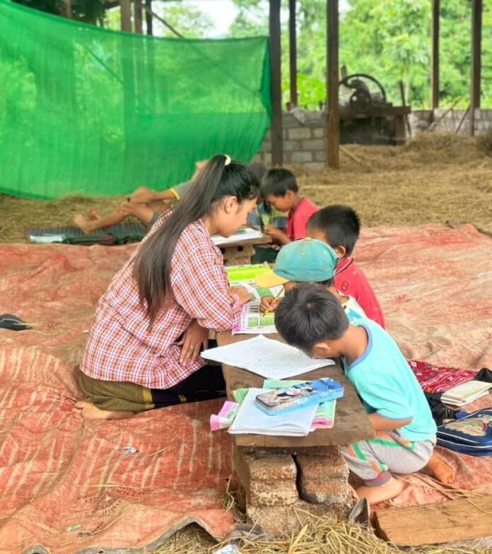 “မိဘ၊ မိသားစုတွေတော့ ခြံထဲမှာပဲ စုနေကြတယ်ပေါ့နော်။ စာသင်ဖို့နေရာ သီးသန့်မရှိတော့ နွားခြံ၊ နွားစာ ထားတဲ့နေရာက မိုးလုံတော့ အဲမှာပဲ စာသင်ကြရတယ်။” လို့ ခြံပိုင်ရှင်ဖြစ်သူက ကလေးငယ်တွေ စာသင်ကြားနေရတဲ့ အခြေအနေကို ရှင်းပြပါတယ်။