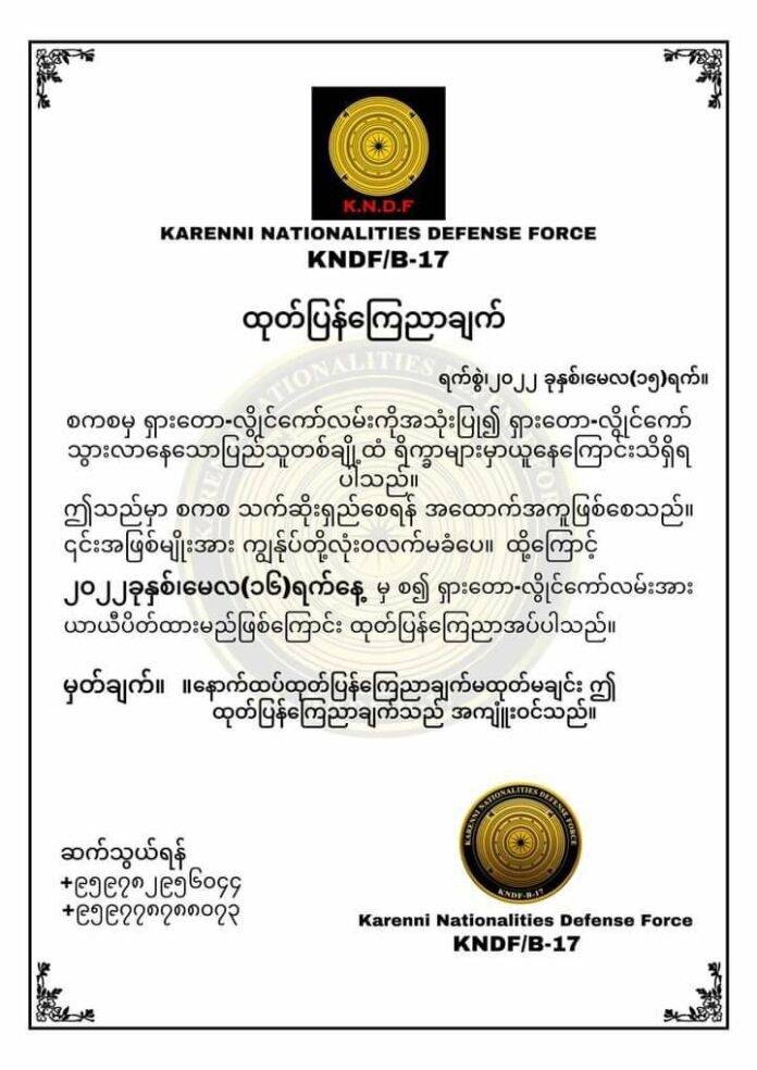 စစ်ကောင်စီတပ်ဟာ ခရီးသွားလာနေတဲ့ပြည်သူတွေကို အသုံးချပြီး ကြားဖြတ်ရိက္ခာတွေ သယ်ယူ ခိုင်းနေတာကြောင့် ရှားတော-လွိုင်ကော်လမ်းကို မေလ ၁၆ ရက်က စပြီး ယာယီပိတ်ထားကြောင်း KNDF B-17က ထုတ်ပြန်ထားပါတယ်။