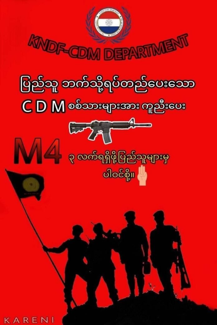 ကရင်နီပြည်သူ့ရင်ခွင်ကနေ “ ပြည်သူ ဘက်သို့ရပ်တည်ပေးသော CDMစစ်သားများအား ကူညီပေး” ဆိုတဲ့ M4 သေနတ် ၃လက်ရရှိဖို့အတွက် ပထမဆုံးကမ်ပိန်းတစ်ခုကို ပြုလုပ်ခဲ့ပြီး ကမ်ပိန်း ၂၆ရက်အထိ ၇၉ရာခိုင်နှုန်းလိုအပ်သေးတယ်လို့ ကရင်နီပြည်သူ့ရင်ခွင်တာဝန်ခံ ကိုယုန်လေးက နိုဝင်ဘာလ ၂၅ရက်နေ့မှာ ကန္တာရဝတီတိုင်း(မ်)ကို ဖြေကြားပါတယ်။