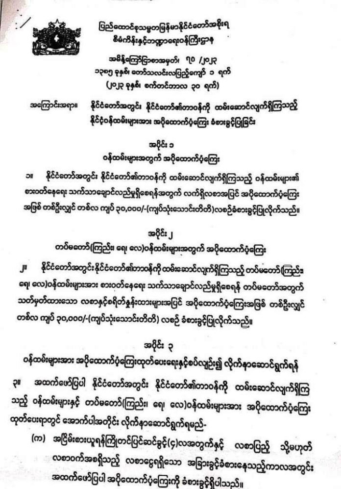 ပြီးခဲ့တဲ့ စက်တင်ဘာလ ၃၀ ရက်နေ့မှာ စစ်ကောင်စီက ဝန်ထမ်းတွေကို ထောက်ပံ့မှုတွေပေးသွားမယ်လို့ ကြေညာခဲ့တာဖြစ်ပါတယ်။ ဒီလိုထောက်ပံ့မှုကို အောက်တိုဘာလကုန်မှစတင်ပြီး စစ်ကောင်စီ လက်အောက်မှာ တာဝန်ထမ်းဆောင်နေတဲ့ အမြဲတမ်း ဝန်ထမ်းတိုင်း ရရှိမှာဖြစ်ပါတယ်။