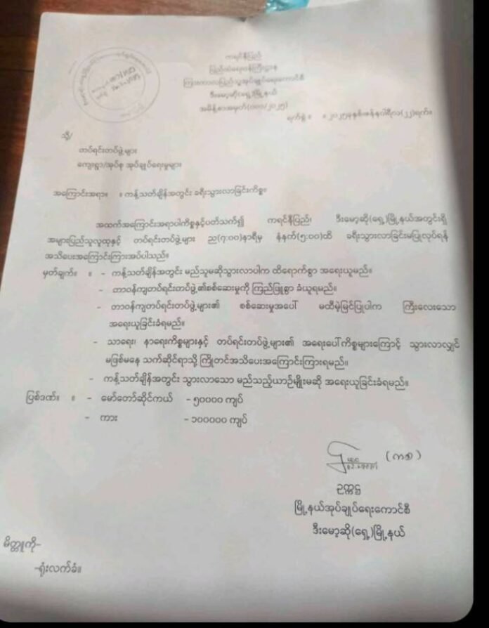 အရေးပေါ်ကိစ္စများအား အကြောင်းမကြားဘဲ ကန့်သတ်ချိန်အတွင်း သွားလာပါက မော်တော်ဆိုင်ကယ် ၁ စီးကို ၅၀,၀၀၀ ( ငါးသောင်းကျပ်) ၊ ကားတစ်စီးကို ၁၀၀,၀၀၀ (တစ်သိန်း ) ကျပ် ဒဏ်ငွေပေးဆောင်ရမယ်လို့ ထုတ်ပြန်ချက်မှာ ဖော်ပြထားပါတယ်။