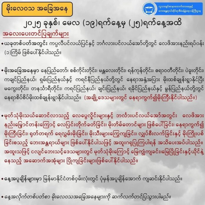 Homeသတင်းကရင်နီပြည်အပါအဝင် ဒေသတချို့မှာ တစ်ပတ်အတွင်း မိုးထစ်ချုန်းရွာသွန်းနိုင်၊ ရေလွမ်းမိုးခြင်း၊ မိုးသီးကြွေခြင်းနဲ့ မိုးကြိုးအန္တာရာယ်တွေကို သတိထားသင့်