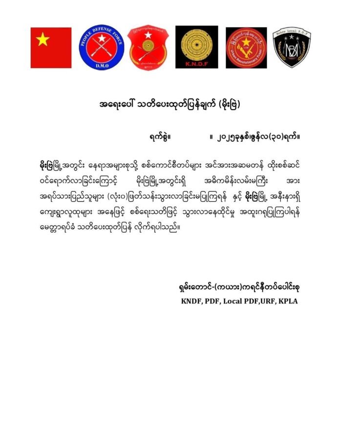 ရှမ်း-ကရင်နီ နယ်စပ် မိုးဗြဲမြို့ကို စစ်ကောင်စီတပ်က အင်အားအလုံးအရင်းဖြင့် စစ်ကြောင်းထိုးဝင်ရောက်နေပြီး တိုက်ပွဲများ မကြာခဏ ဖြစ်ပွားနေတာကြောင့် မိုးဗြဲမြို့လမ်းမကြီးကို အရပ်သားပြည်သူများ (လုံးဝ) ဖြတ်သန်းသွားလာခြင်း မပြုလုပ်ကြပါဖို့ ရှမ်းတောင် – (ကရင်နီ) တပ်ပေါင်းစုက ဇွန်လ ၃၀ ရက်နေ့ မှာ သတိပေးထုတ်ပြန်ထားပါတယ်။