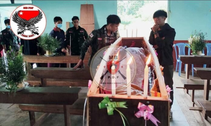 ကျဆုံးသွားတဲ့ ရဲဘော်ဟာ NUG လက်အောက်ခံ 1001 တပ်ရင်း၊ မိုးဗြဲ ပြည်သူ့ကာကွယ်ရေးတပ်၊MBPDF၊ သိမ်းငှက်တပ်ခွဲမှာ တာဝန်ထမ်းဆောင်နေတဲ့ တပ်စုမှူး မောင်နိုင်ထွန်း ဖြစ်ပြီး စျာပနကိုတော့ မိုးဗြဲမြို့တနေရာမှာ မိသားစု၊ ဆွေမျိုးတွေနဲ့ အတူ ပြုလုပ်ပေးခဲ့တယ်လို့ မနေ့က စက်တင်ဘာလ ၂ ရက်နေ့မှာ မိုးဗြဲ PDF သိမ်းငှက်တပ်ခွဲက အသိပေးထုတ်ပြန်ထားပါတယ်။