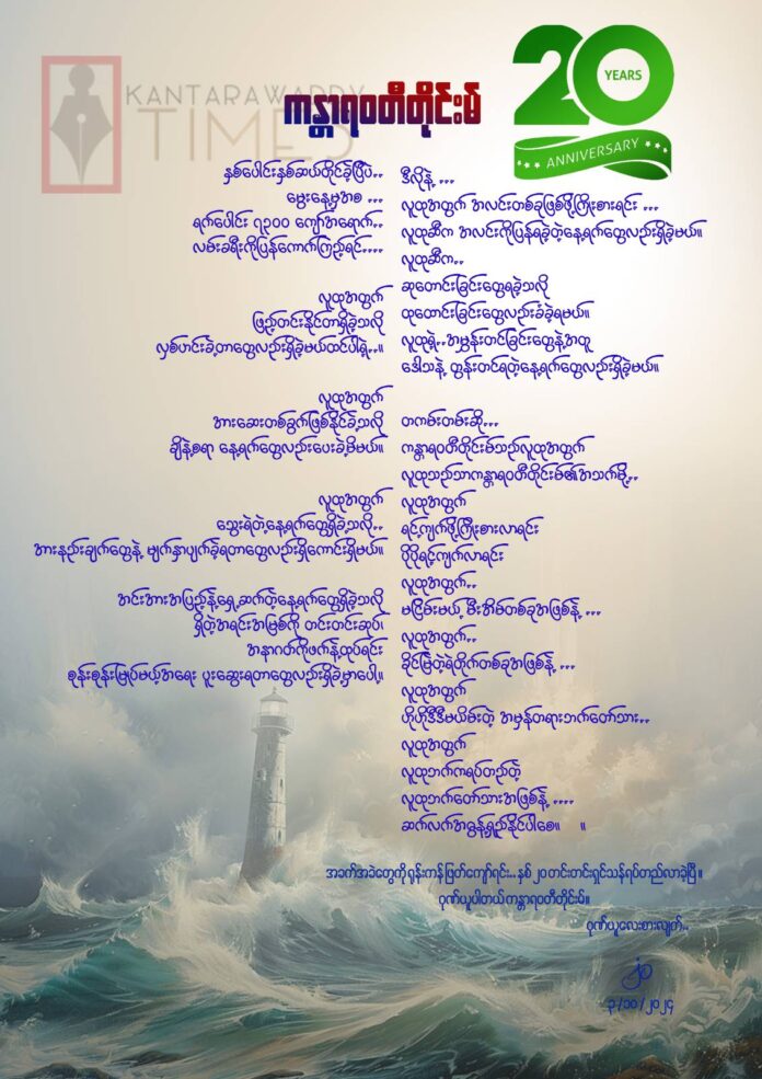 Sign in Welcome! Log into your account your username your password Forgot your password? Get help Password recovery Recover your password your email A password will be e-mailed to you. Homeအတွေးအမြင်ကန္တာရ၀တီတိုင်း(မ်) တည်ထောင်ခြင်း နှစ် ၂၀ပြည့် အထိမ်းအမှတ် အနေနဲ့ JD ရဲ့ ဂုဏ်ပြုကဗျာ အတွေးအမြင် ကန္တာရ၀တီတိုင်း(မ်) တည်ထောင်ခြင်း နှစ် ၂၀ပြည့် အထိမ်းအမှတ် အနေနဲ့ JD ရဲ့ ဂုဏ်ပြုကဗျာ By Kantarawaddy Times - October 3, 2024 1109 FacebookTwitterWhatsAppTelegramViber Previous articleရေဘေးသင့်တဲ့ စစ်ဘေးရှောင်တွေ ဖျားနာမှု၊ ယားနာမှုအဖြစ်များNext articleကန္တာရဝတီတိုင်း(မ်) သတင်းဌာနရဲ့ နှစ်(၂၀) ပြည့်နှစ်ပတ်လည်နေ့ အထိမ်းအမှတ် အခမ်းအနားပြုလုပ် ဆက်စပ်သတင်းများ “ကျေးဇူးကြီးလှ တို့အဘ” အိပ်မက်ထွက်ပေါက် ” Humanitarian Aid ကို အမှုန့်ကြိတ်ခြင်း” မေလ ဒုတိယပတ် ရဲ့ တနင်္ဂနွေနေ့မှာ ကျရောက်တဲ့ မိခင်များနေ့ မှာ မွေးမိခင်အတွက် ရည်စူးပြီး ရေးသားပေးပို့လာတဲ့ CDM သူနာပြု တဦးရဲ့ အမေ့ထံပေးစာကို ကန္တာရဝတီတိုင်း(မ်) ပရိတ်သတ်တွေ အတွက်ဖော်ပြပေးလိုက်ပါတယ်။ တောင်းဆု “အသုဘစရိတ်” လူဖတ်အများဆုံး သတင်းများ ဖမ်းဆီးခံရတဲ့ လူငယ် (၇၀)ဝန်းကျင်နဲ့ပတ်သက်ပြီး (KNPP) ရဲ့ အတွင်းရေးမှူး-၂ ခူးဒယ်နီရယ်နဲ့ဆက်သွယ်မေးမြန်း အမျိုးသားတစ်ဦးကို ဝိုင်းဝန်းထိုးကြိတ်ပြီး ဂူတွင်းပစ်ချသေဆုံးမှုဖြစ်ပွား ဒီမော့ဆိုတိုက်ပွဲမှာ KNDF အဖွဲ့ဝင်တစ်ဦးနဲ့ ရွာသားတစ်ဦးကျဆုံး ယမနေ့ည လွိုင်ကော်မြို့၊ ဒေါဥခူကွက်ဟောင်းရှိ လူနေအိမ်ခြံဝန်းတစ်ခုအတွင်း အသံကျယ်လောင်တဲ့ ပေါက်ကွဲမှုဖြစ် ဖယ်ခုံအရှေ့ဖက်ကမ်းတွင် ဒလန်လို့ သတင်းထွက်နေတဲ့ လင်မယား ပစ်သတ်ခံရ CDM သူနာပြု ၂၀၀ဦးနဲ့ ဖွဲ့စည်းထားတဲ့ KNA က ကျန်းမာရေးဝန်ဆောင်မှုပေး ကရင်နီတပ်မတော် (K-Army) အမှတ်(၁) နည်းဗျူဟာမှူး ဗိုလ်မှူးကြီးအယ်မွီးနှင့် တွေ့ဆုံခြင်း ဆက်စပ်အမျိုးအစားများသတင်းKT FMမာလ်တီမီဒီယာရုပ်သံအစီအစဉ်ကရင်နီဘာသာ FM Radioမြန်မာဘာသာ FM Radioဆောင်းပါးအင်တာဗျူးကရင်နီဘာသာ ရေဒီယိုအတွေးအမြင်ကာတွန်းအမျိုးသမီးအခွင့်အရေးဂျာနယ်အယ်ဒီတာ့အာဘော်In-depth Featureအယ်ဒီတာ့ထံ ပေးစာGenderကဗျာFact-CheckingNews Feature